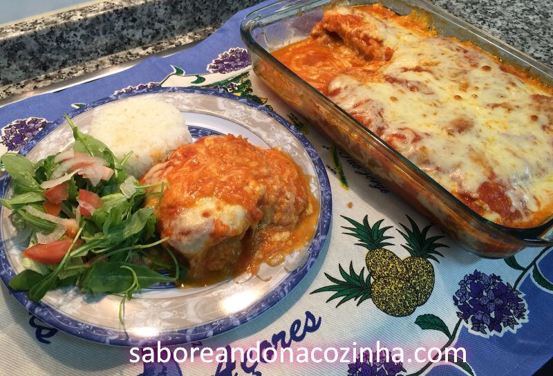 Colocar um pouco do molho em um refratário, colocar os filés já fritos, espalhar a muçarela por cima e em seguida colocar o molho, finalizando com um pouco mais de muçarela e o queijo ralado.